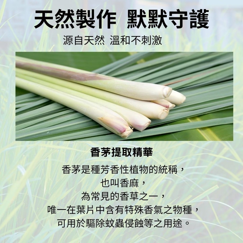 採用天然香茅精油,驅蚊有效、香氣宜人,不刺鼻、不含甲醇,家中有小孩、寵物也安心