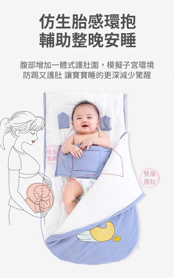 - 仿生護肚圍: 模擬子宮包覆設計,緊湊而不束縛,有效減少驚跳反射,全方位保護小肚肚不受涼。