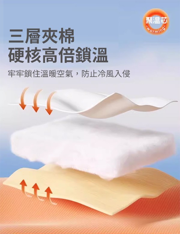 - 三層夾棉鎖溫: 核心聚溫技術,牢牢鎖住溫暖空氣,即便在冷氣房或寒流來襲也能恆溫守護。