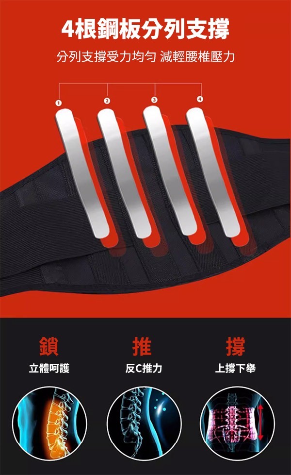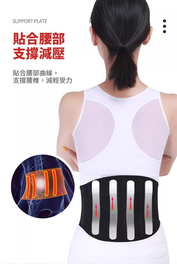 - 強立支撐,腰部固定: 內建 4 根鋼板,強力支撐腰椎,維持正確體態,減輕腰部負擔。