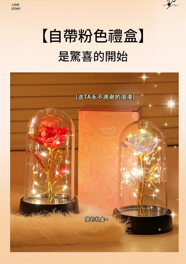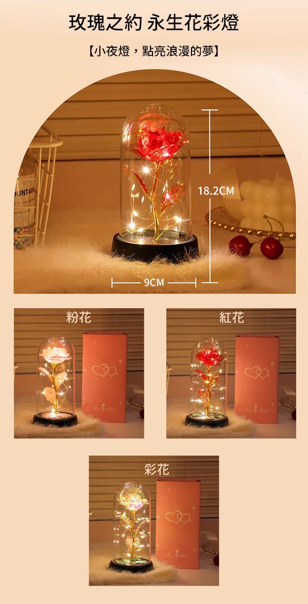 - 經典紅花:熱烈如初,象徵至死不渝的愛。在微光的守護下,綻放最耀眼的光芒。