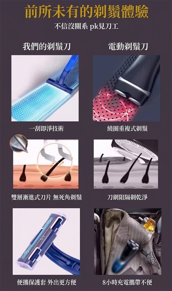 - 雙層不鏽鋼刀片: 漸進式排列,第一層拉起鬍鬚,第二層深層切斷,淨鬚無死角。