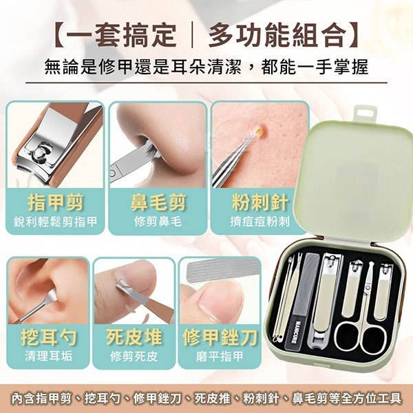- 整組= 鼻毛剪、死皮推、斜口剪、大指甲刀、小指甲刀、挖耳勺、修甲銼刀、收納盒