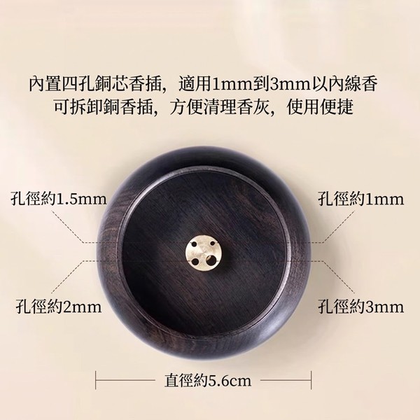 - 多孔設計: 內置四孔銅芯香插,支援 1mm - 3mm 多種規格線香。