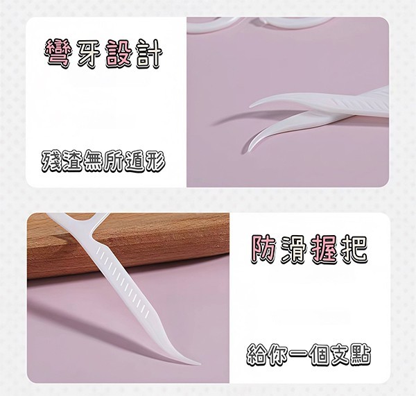 尾端採用貼心的 彎牙設計,可兼作牙籤使用,深度清潔後方磨牙區的食物殘渣。