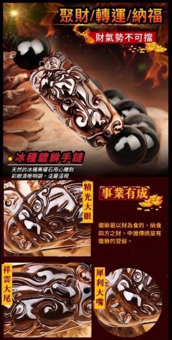 - 聚財貔貅: 傳說貔貅有嘴無肛,能吞萬物而不洩,寓意招財進寶、只進不出。