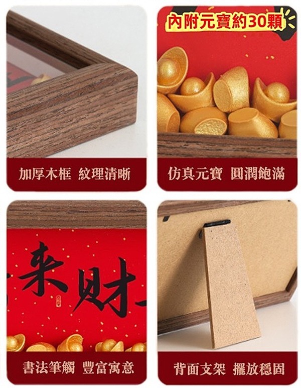 3個以上 $119元/個 - 內附元寶約30顆 - 加厚木框,紋理清晰 - 仿真元寶,圓潤飽滿 - 書法筆觸,豐富寓意 - 背面支架,擺放穩固 【下單前:務必"詳閱購物須知,下單視為接受"購物須知"內容】 【下單不保留商品,要結單請主動與客服聯繫】 【公司提供多種下單管道,庫存數量僅供參考,實際數量請洽小幫手】
