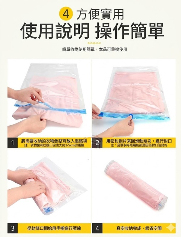 1-放: 將衣物折疊平整放入袋中(建議留出 3-5cm 封口距離)。