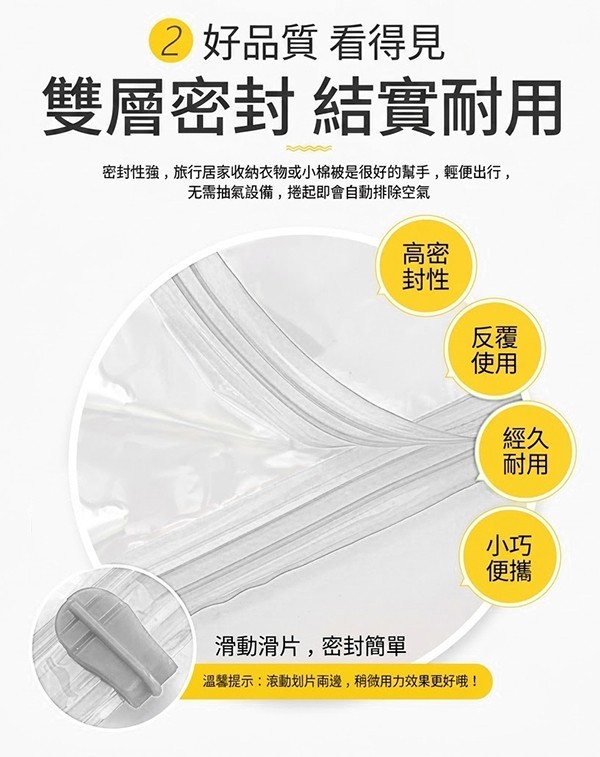 - 雙層密封條: 高密合度封口,搭配專屬滑片,確保滴水不漏、長效不漏氣。
