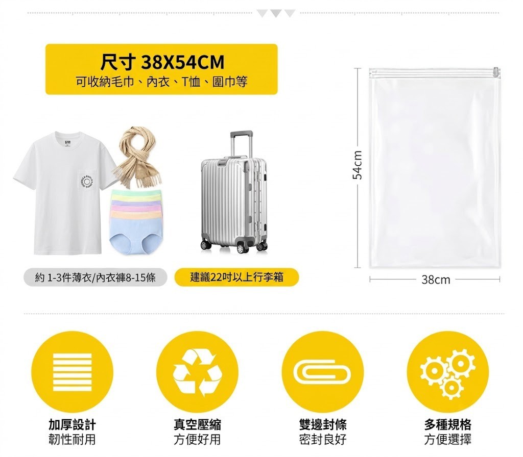 - 空間節省 75%: 輕鬆壓縮毛巾、T恤、甚至小棉被,讓行李箱多出驚人空間放戰利品!