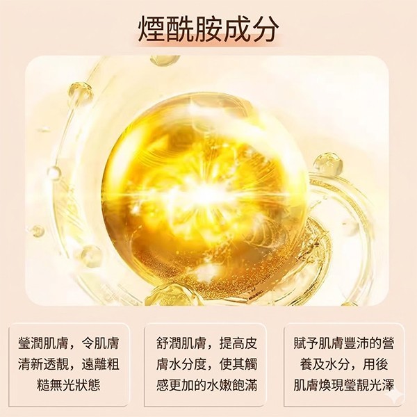 。煙醯胺 (Niacinamide): 幫助嫩滑肌膚、水潤細膩、輕透柔膚、自然勻淨。