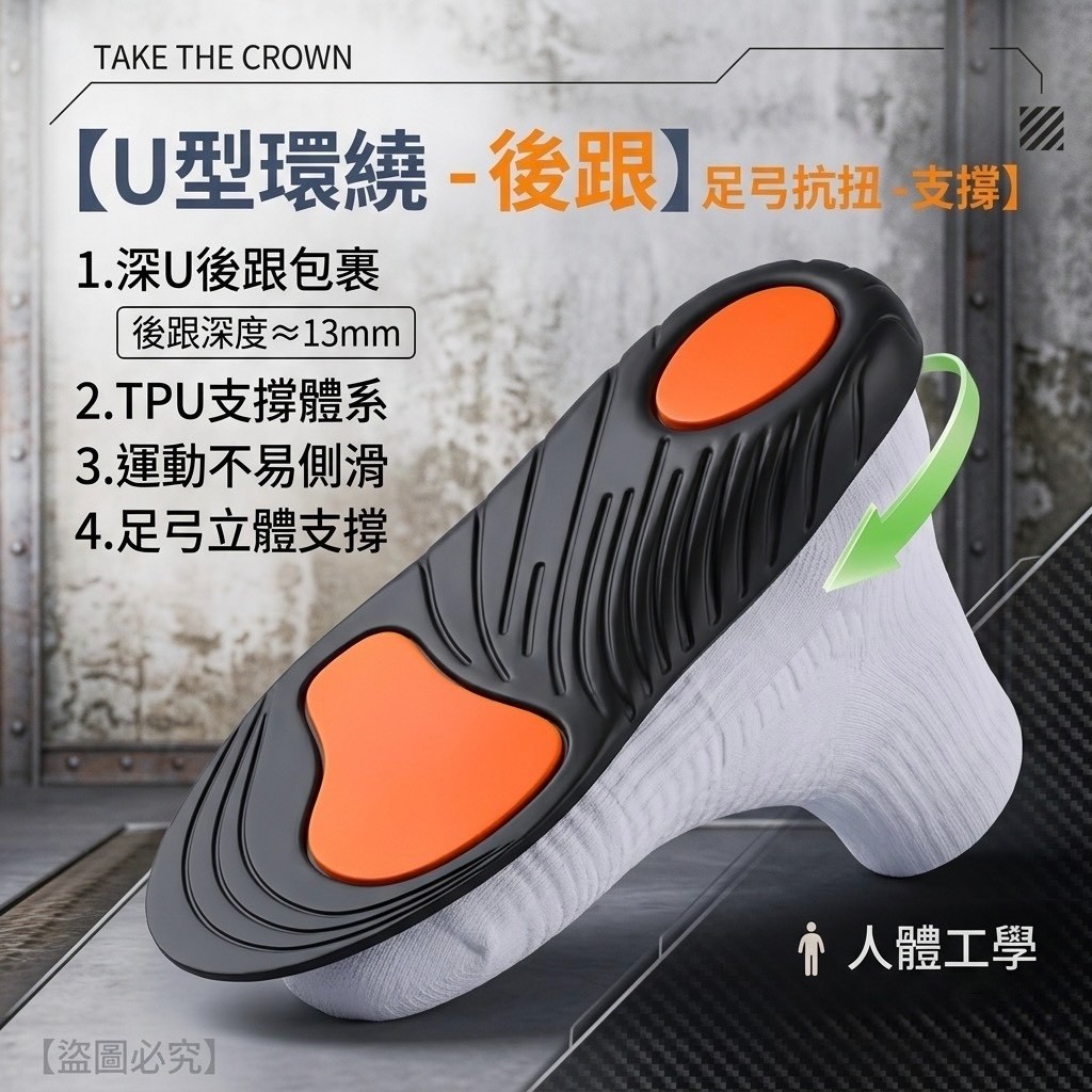 - U型環繞設計: 13mm超深U型坑,完美包裹後腳跟,穩定重心,走路、運動不再輕易側滑!