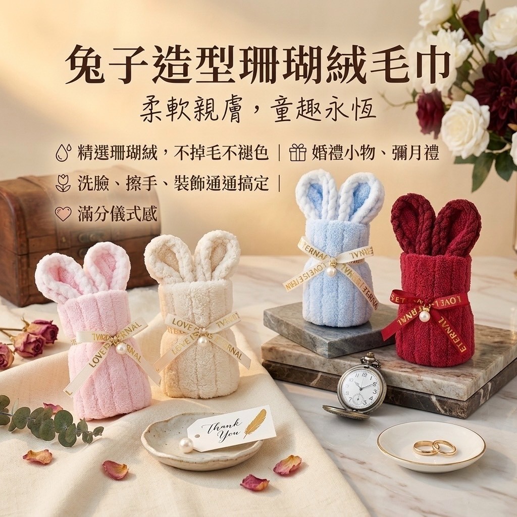 - 顏值天花板,儀式感直接滿分: 每一隻萌兔都配有精緻的「LOVE IS ETERNAL」燙金絲帶與極光珍珠,這哪裡是毛巾,根本是精靈!
