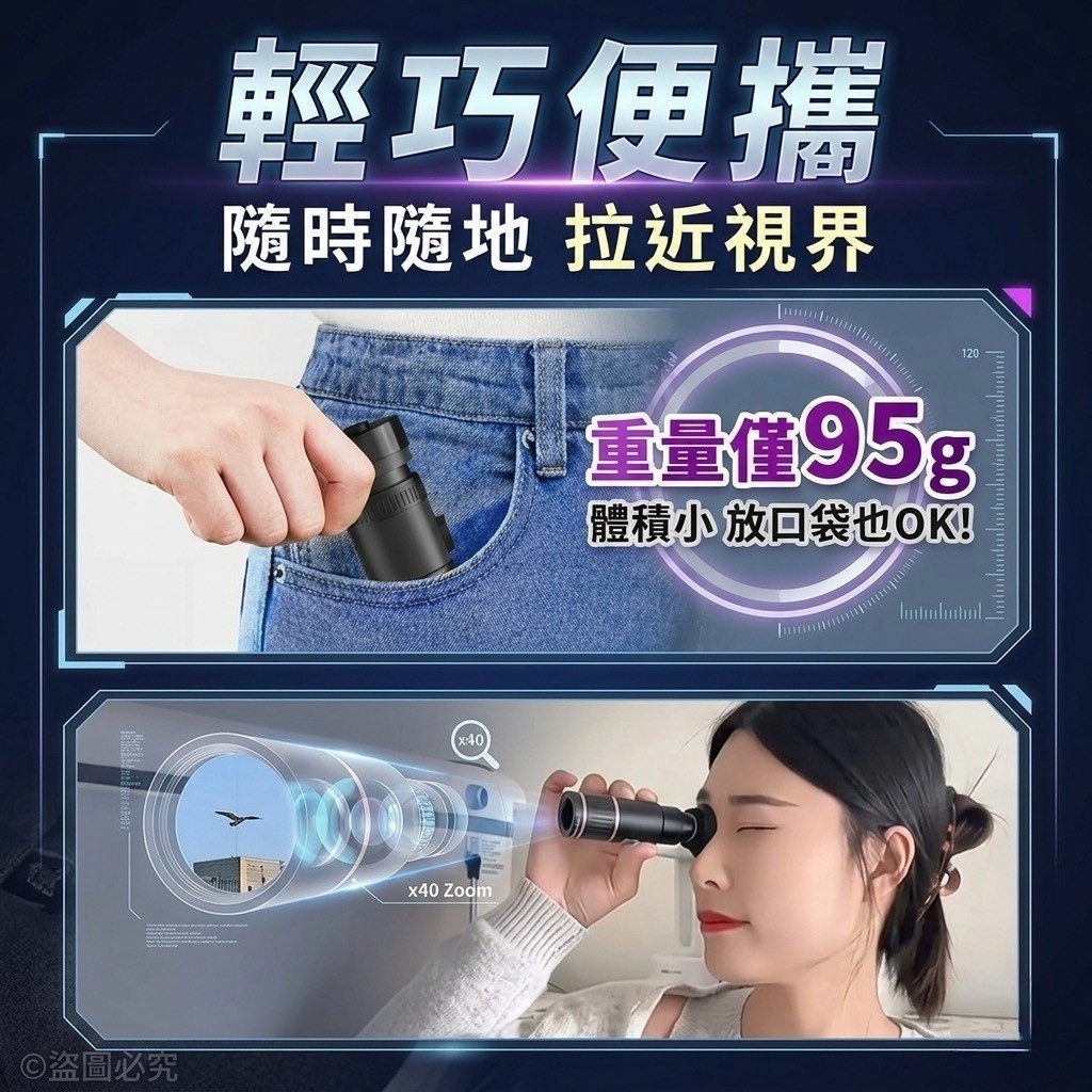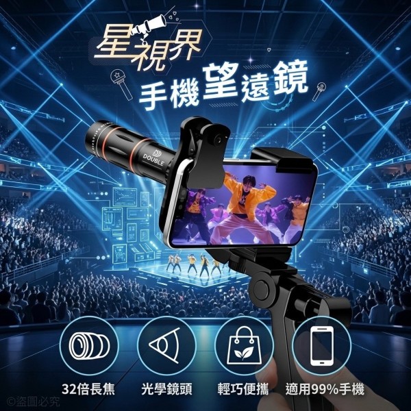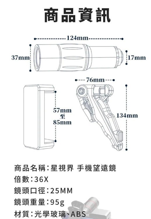 內容物:望遠鏡/望遠鏡頭蓋/鏡頭夾/手機夾/手持三角架/望遠鏡眼蓋/拭淨布/收納袋/收納盒