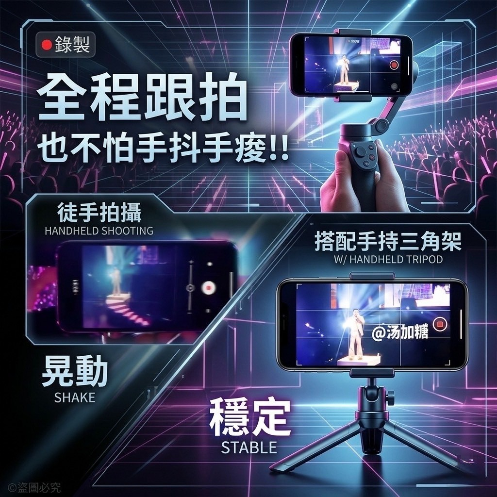 搭配專屬手持三角架,告別手抖晃動。不管是拍影片還是直播,畫面穩得像專業攝影師。