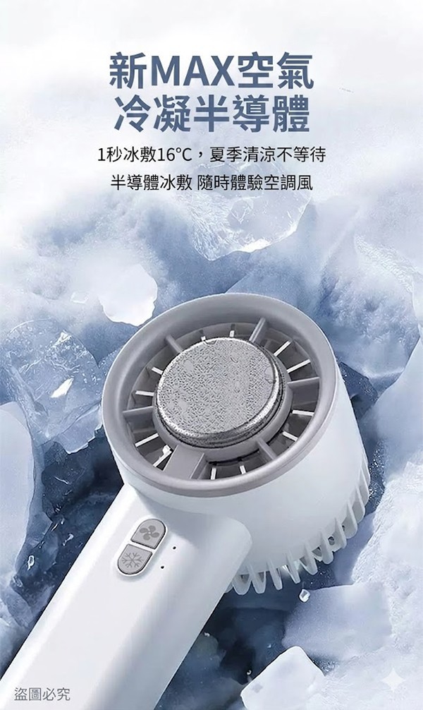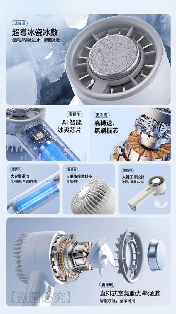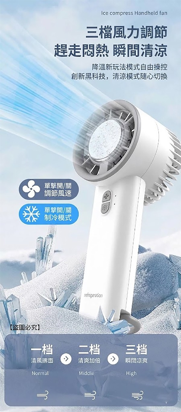 - 內置半導體製冷芯片,前端圓形金屬區可瞬間結冷。100 檔無極調速(精準控風)