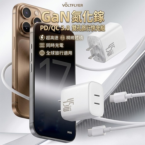 - 45W GaN 氮化鎵 PD/QC 3.0 雙孔旅行快充組 (附快充線)