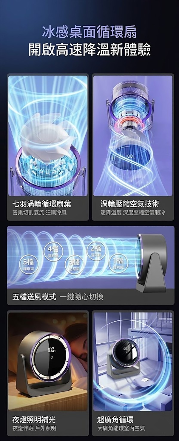 - 細節滿分: 氛圍夜燈設計,是循環扇也是溫馨床頭燈;桌掛兩用,辦公、露營、居家皆能完美適應。