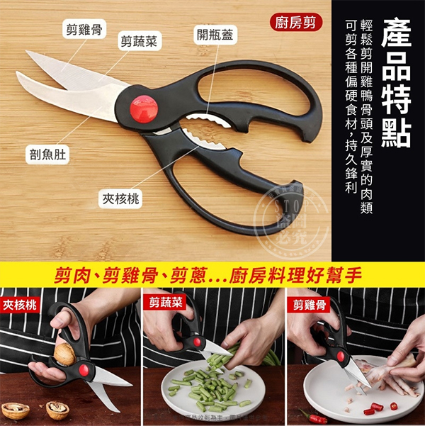 * 舒適手柄,好握好拿取,使用更順手,剪蔬菜、剪魚肚、剪雞骨、夾核桃、剪布料、剪紙、剪紙箱、剪線等