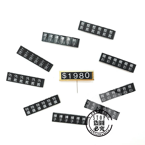 市價:399元/盒 >>起批1盒 一盒70元 >>10盒以上 一盒50元 * 質感精緻,價格印字清晰,密合度極佳,不會散開 * 簡單使用方法,輕鬆變換價格 * 顏色:黑底白字 * 單針 16支、數字片 160片、中文字 54片 * 適合服飾 店面使用 (公司提供多種下單管道,庫存數量僅供參考,實際數量請洽小幫手)