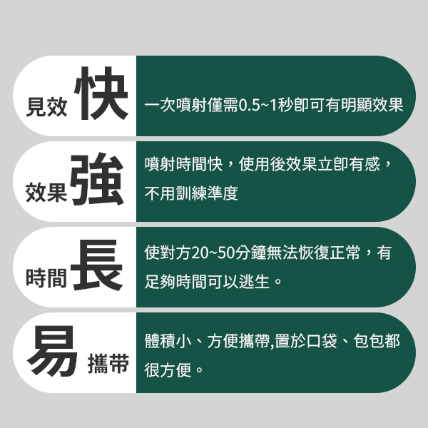 * 遇到危險,只需對著歹徒噴射,就可以瞬間使他完全失去進攻能力。