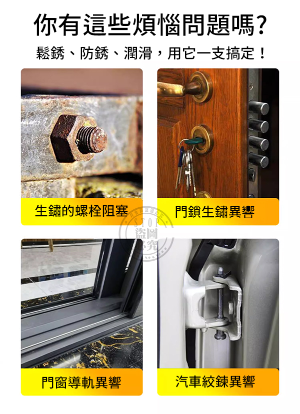 * 門窗轉軸有雜音、腳踏車鏈條不順、螺絲很難拔除、電扇運轉有異、運動器材保養清潔、縫紉機軸心保養 等......。