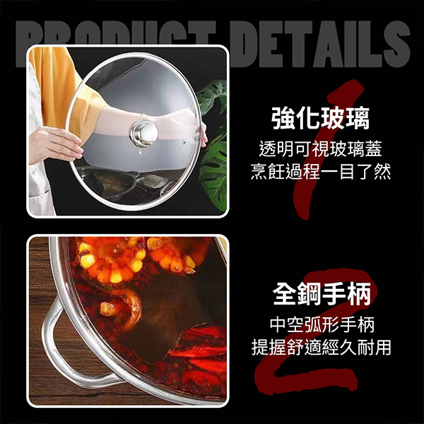 * 一鍋雙享受,享受美味不必糾結 * 鴛鴦雙味 不串味 - 雙味鴛鴦設計,原味麻辣齊共享 * 可視透明鍋蓋 - 可視化設計,輕鬆掌握食材烹煮進度 * 提把設計 - 用料厚實,好端拿穩固更便利 * 涮肉無需等待 - 導熱快速,涮肉秒熟不必等 * 304加厚不鏽鋼,均勻受熱 【下單前:務必"詳閱購物須知,下單視為接受"購物須知"內容】 【下單不保留商品,要結單請主動與客服聯繫】 【公司提供多種下單管道,庫存數量僅供參考,實際數量請洽小幫手】