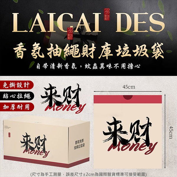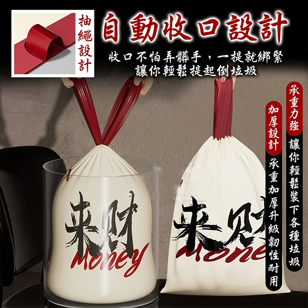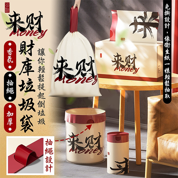 7盒以上 $69元/盒 ~ 壞的去~好的來!來財垃圾袋~帶走壞運~財運跟著來 * 束口設計,讓你輕鬆提起倒垃圾~收口不怕弄髒手 * 加厚設計,承重耐用韌性超級好 * 免撕設計,輕鬆像衛生紙一樣抽取 * 自帶清新香氛,蚊蟲異味不用擔心 * 材質:PE * 尺寸:45x45CM * 包裝:盒裝 【下單前:務必"詳閱購物須知,下單視為接受"購物須知"內容】 【下單不保留商品,要結單請主動與客服聯繫】 【公司提供多種下單管道,庫存數量僅供參考,實際數量請洽小幫手】