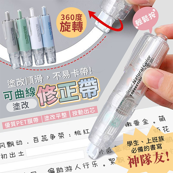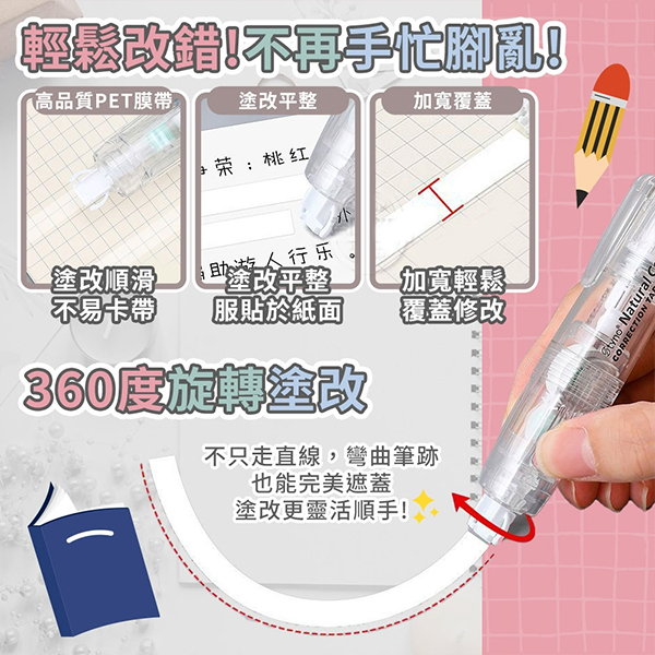 * 360度旋轉塗改帶頭,不只走直線,彎曲筆跡也能完美遮蓋,塗改更靈活順手!