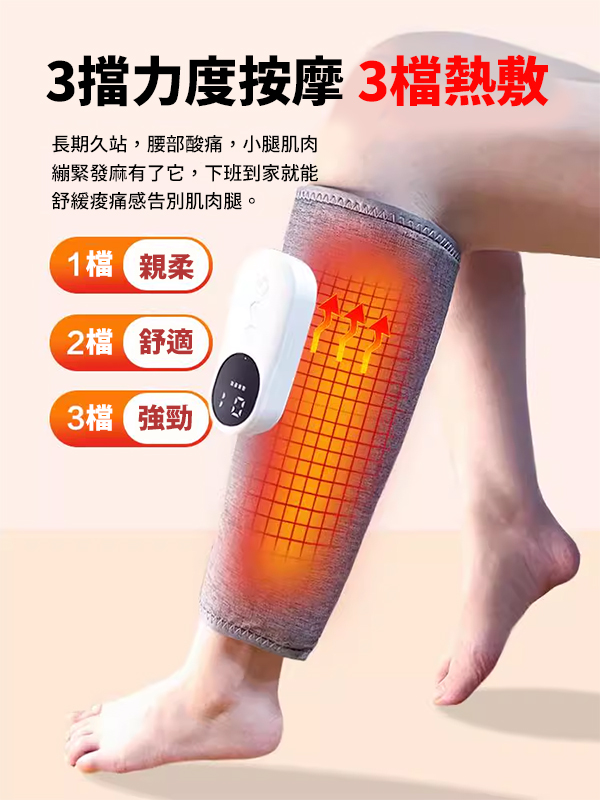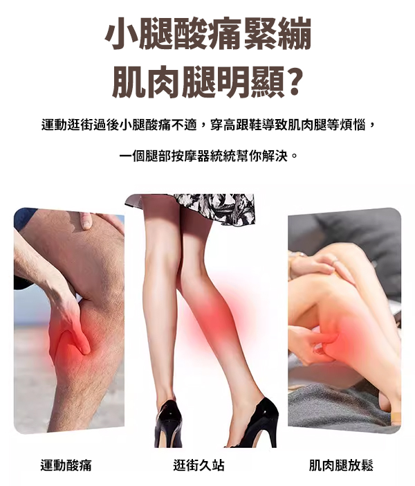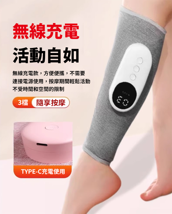 無線便攜設計,隨時放鬆腿部:充電式設計,無線使用更方便,適合居家、辦公室或旅行時隨時享受按摩。