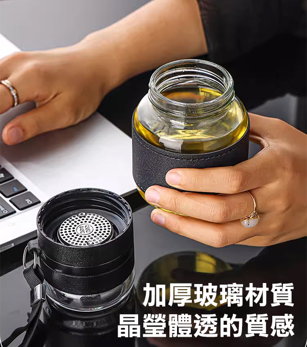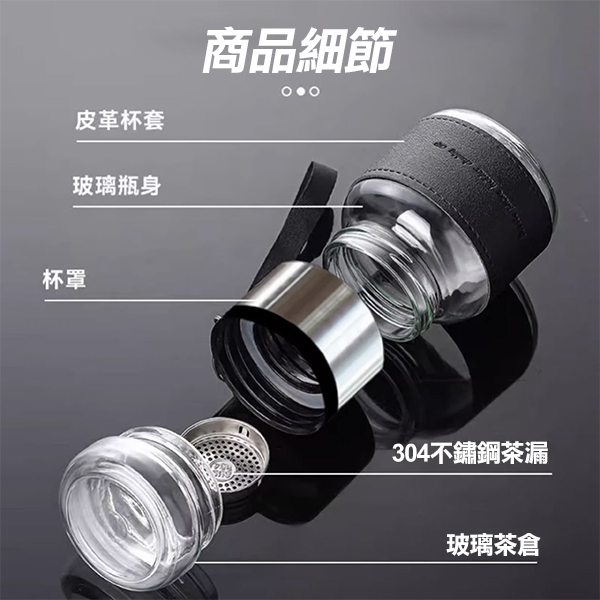 內附304不銹鋼茶漏,能有效隔離茶葉,讓茶湯口感更順滑。再搭配手提繩和皮質杯套,讓你的品味再提升一個檔次。