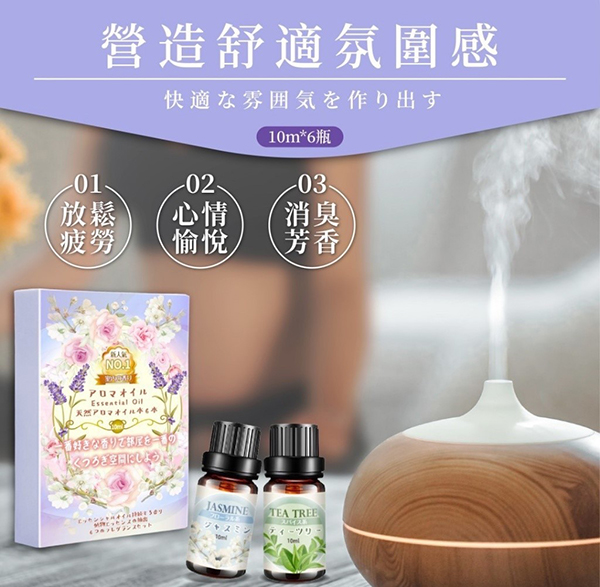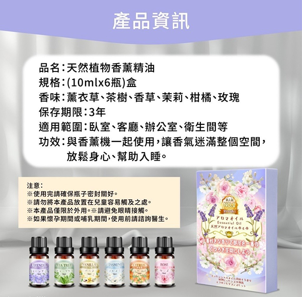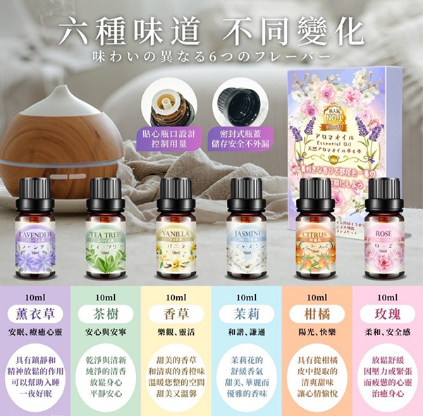* 香味:薰衣草*1、茶樹*1、香草*1、茉莉*1、柑橘*1、玫瑰*1