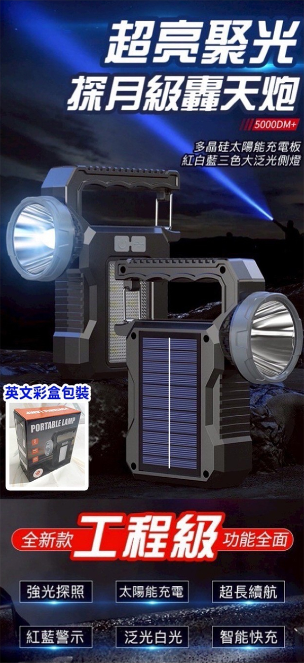 5盒以上 $80元/盒 - 全新工程級功能全面 - 強光探照、太陽能充電、超長續航 - 紅藍警示、泛光白光、智能快充 - 探月級轟天炮,超亮聚光! - 高功率超亮遠射,超亮泛光、高光密度、超低能耗 遠近兼顧鋪光面積大 - 紅藍光警示照明,夜間應急警示求救照明, 穿透力強,必要時可以代替三角警示牌。 【下單前:務必"詳閱購物須知,下單視為接受"購物須知"內容】 【下單不保留商品,要結單請主動與客服聯繫】 【公司提供多種下單管道,庫存數量僅供參考,實際數量請洽小幫手】