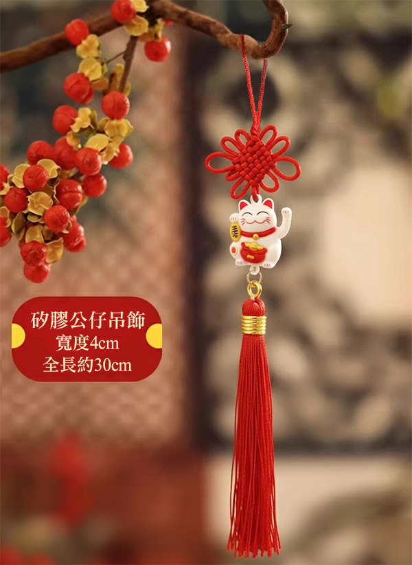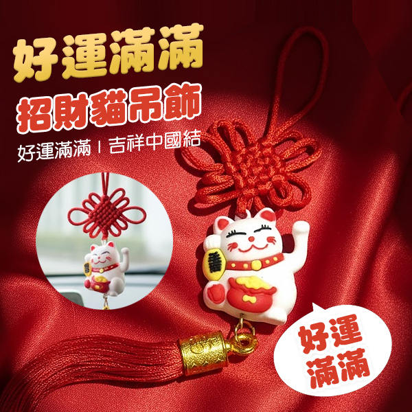 - 這款精美的中國結招財貓吊飾,以喜氣洋洋的紅色中國結(寓意吉祥、團圓)為頂,