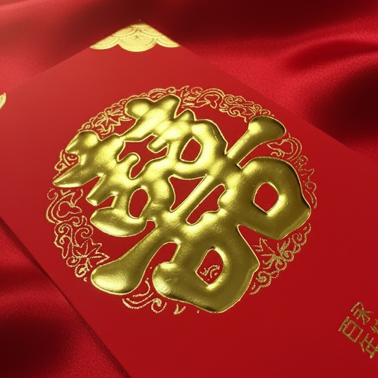 - 立體燙金工藝: 飽滿的金色「囍」字,浮雕質感,手感極佳。