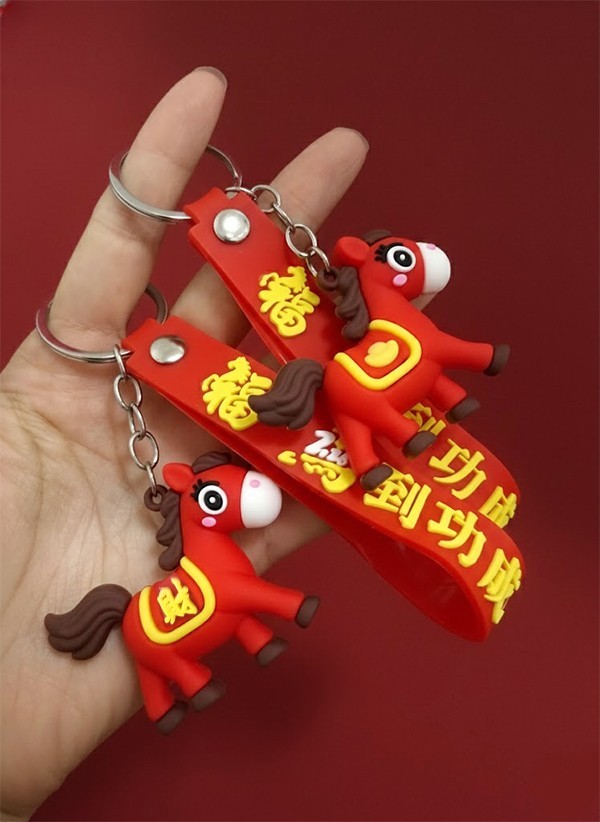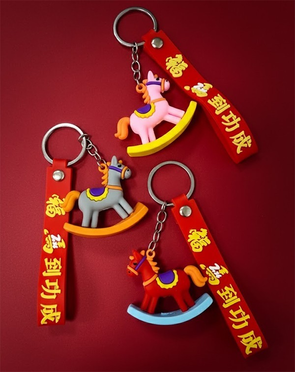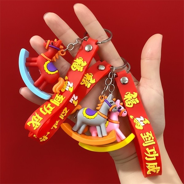 - 吉祥寓意:鑰匙圈上的紅色吊帶印有「福」字和「馬到成功」(或「功成」、「功到成功」)等吉祥話,