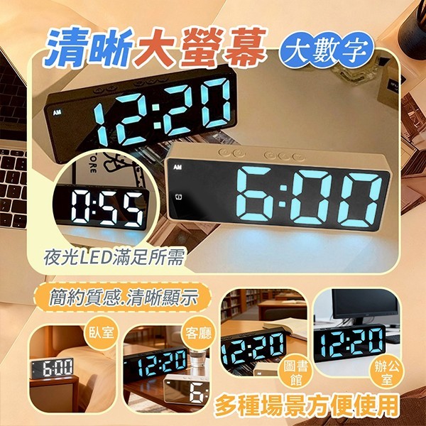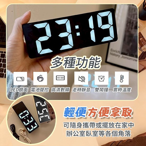 具備LED鏡面、電池聲控、高清數顯、雙鬧鐘、溫度等多種功能,滿足你對時鐘的多種需求。