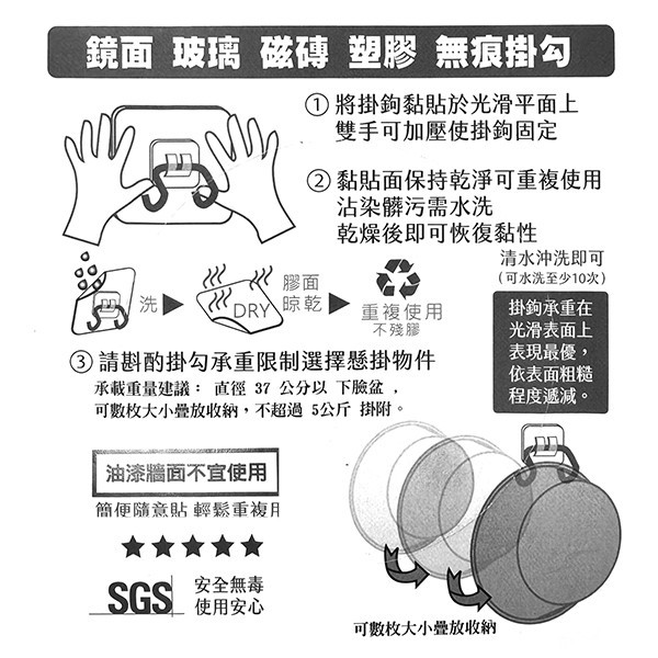 ? 使用說明將掛勾貼片貼於光滑平整的牆面上,用雙手按壓固定。確保黏貼面保持乾燥和清潔,以達最佳效果。