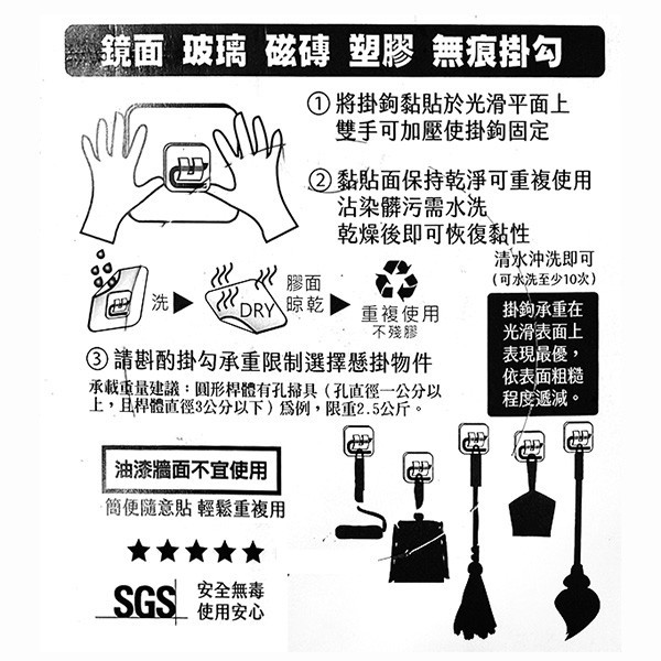 重複使用: 保持黏貼面乾淨乾燥。若有髒污,用清水沖洗晾乾後即可恢復黏性,重複使用,不損牆面!