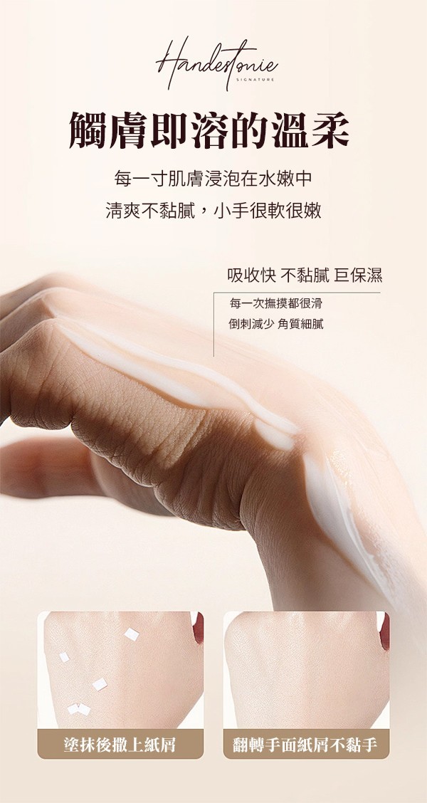- 快速滲透,使用後手部光滑柔嫩,不留殘餘,紙屑不沾手。