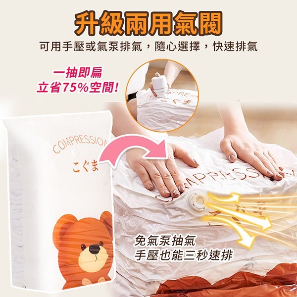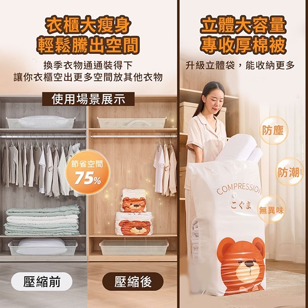 - 大容量壓縮收納袋:幫你把厚重棉被、換季衣物等收納在裡面