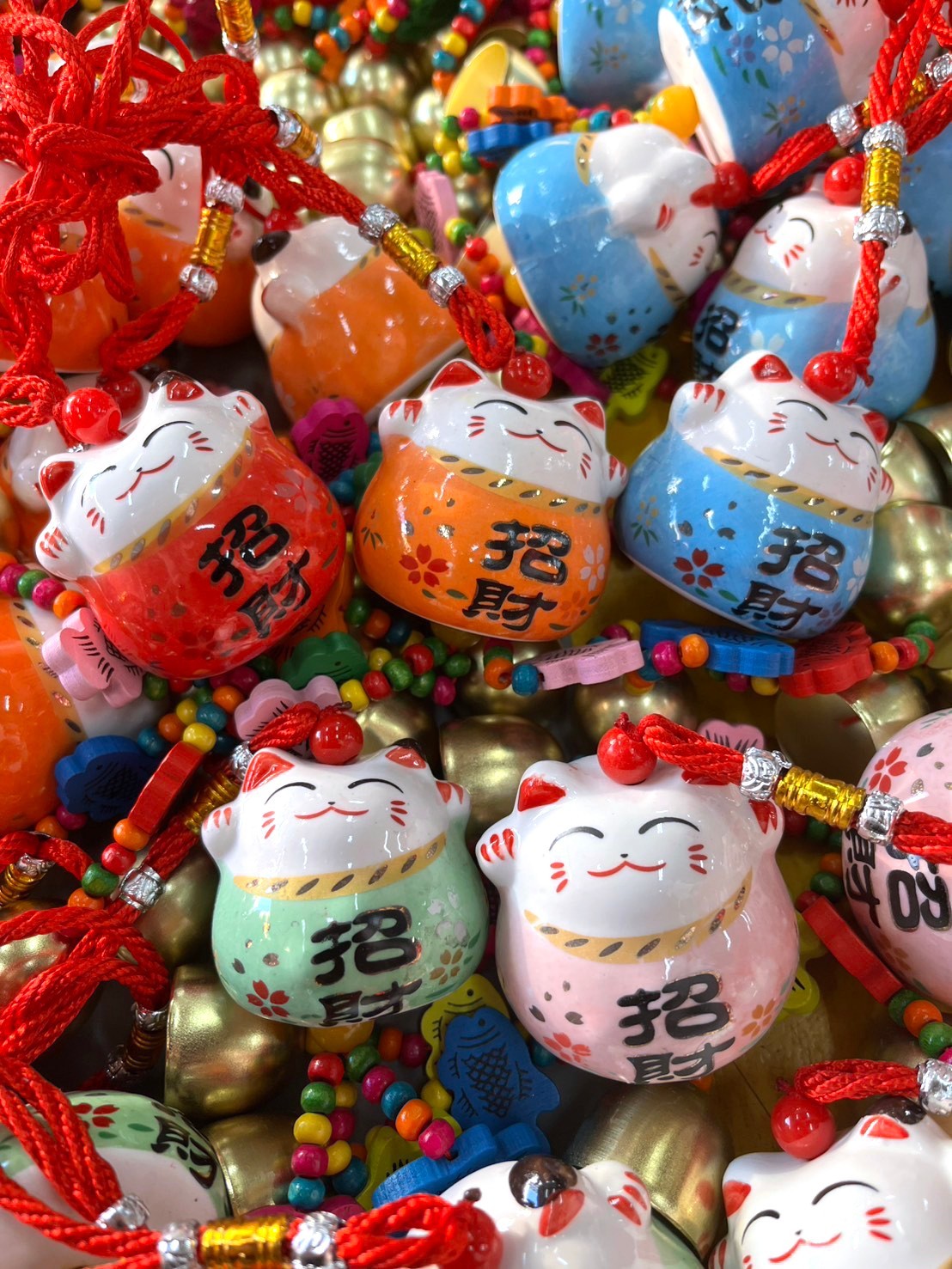 貓身手繪「招財」、「招福」字樣,搭配象徵「年年有餘」的小魚吊飾,幫您招攬貴人、留住財富。