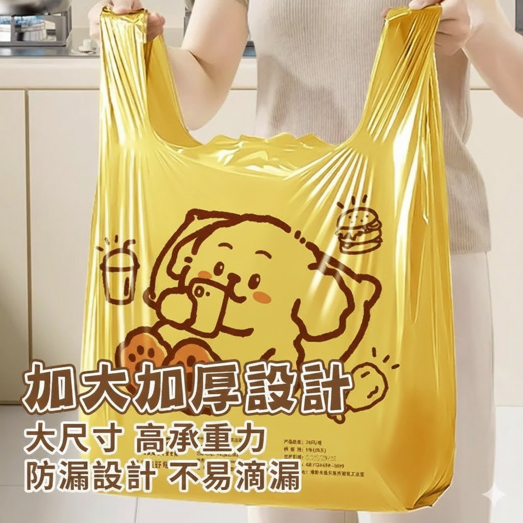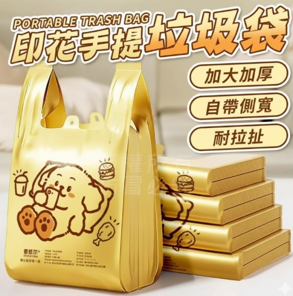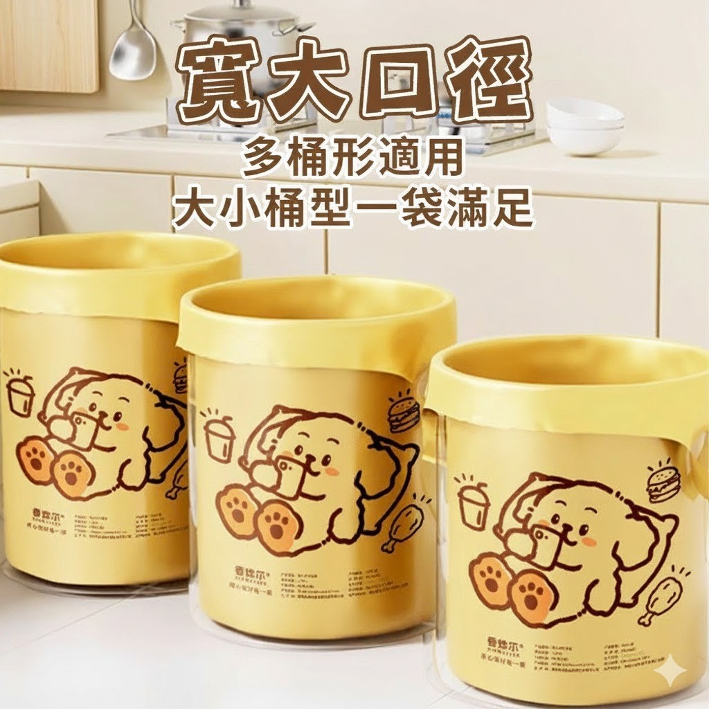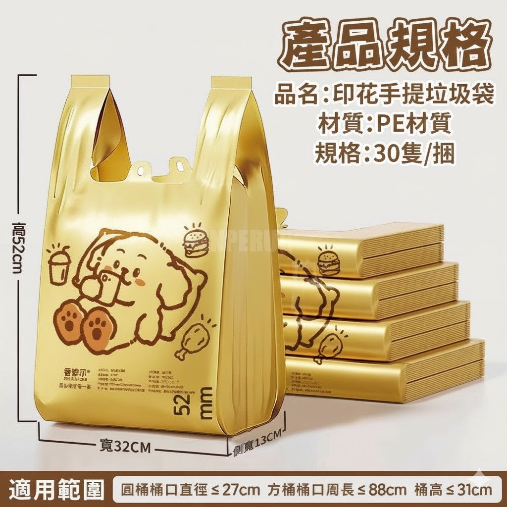 20包以上 $22元/包 ▣ 可愛的萌犬插畫搭配高級感金屬色,放在廚房或客廳完全不突兀,反而像個時尚配件 ▣ 加厚材質:耐拉扯、高承重,不用擔心漏水破裂。 ▣ 寬大側寬:大容量設計,各種尺寸垃圾桶都能輕鬆套入。 ▣ 手提設計:一拉即走,不髒手,便利性滿分! ▣ 收納便利:掛壁式抽取設計,省空間又好拿取。 ▣ 高CP值:一捆30入,兼顧實用與美觀。 ▣ 尺寸:約52公分X32公分