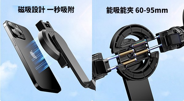 - 雙重固定:磁吸+手機夾雙設計,穩固不掉落。