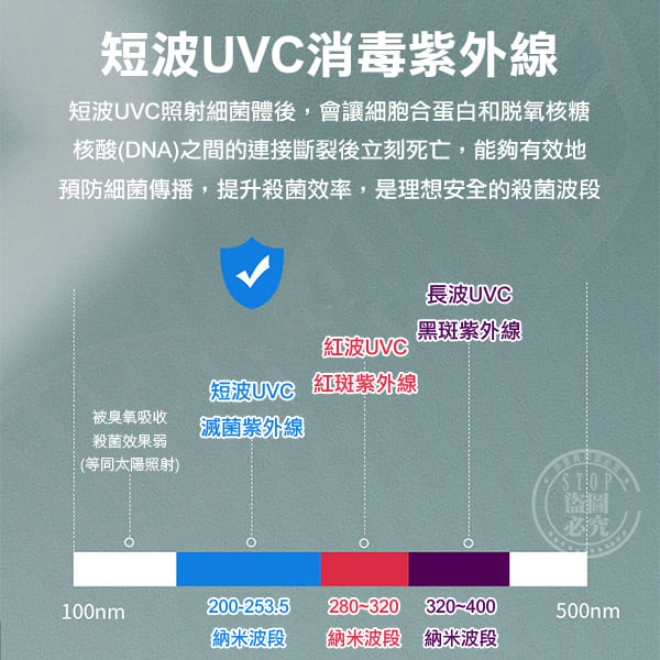 * 短波UV-C的波長介乎於 200-275 納米,又稱為短波滅菌紫外線。