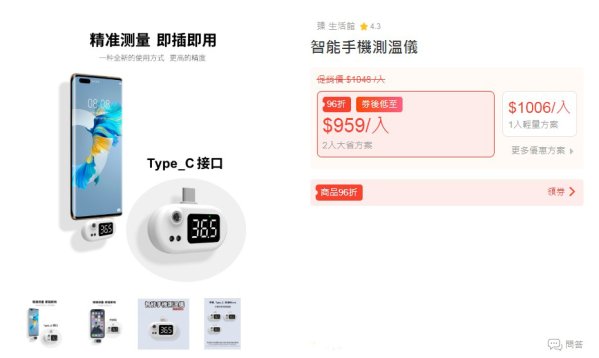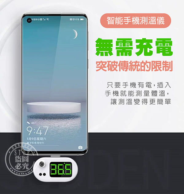 市價:959元/個 >>起批1個 一個110元 >>10個以上 一個100元 * 紅外線探測 測溫快又準 * 測量距離僅需1至10mm * 無物理接觸 安全又衛生 * 即插即用 無需應用程序 * 大型 LED 屏幕顯示溫度 * 在黑暗中也可清晰讀數 ‼ 型號:type-C 插口 ‼ OPPO手機不適用 ‼ 商品無保固服務,請於售出後兩日內完成測試。 (公司提供多種下單管道,庫存數量僅供參考,實際數量請洽小幫手)